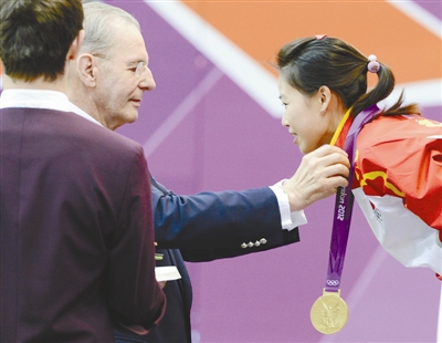 7月28日,国际奥委会主席罗格为易思玲(右)颁发金牌。当日,在第30届夏季奥林匹克运动会女子10米气步枪决赛中,中国选手易思玲以502.9环的成绩获得伦敦奥运会的首枚金牌。 新华社记者 杨磊 摄