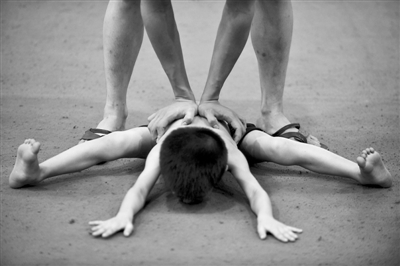 福州市体育运动学校蹦床馆,教练在给一名小孩压韧带。