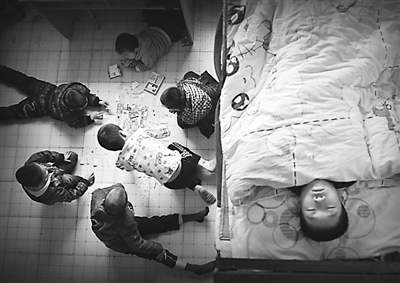 几名小孩在宿舍玩游戏。