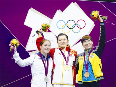 7月29日,中国选手郭文珺(中)、法国选手戈贝维尔(左)和乌克兰选手科斯捷维奇在颁奖仪式上。