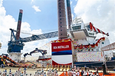 7月24日,由中远船务集团南通中远船务公司为Dong Energy Power A/S (丹麦国家能源公司)旗下A2SEA A/S 公司设计建造的世界第三代自升式海上风车安装船在启东中远海工基地命名为“SEA INSTALLER”(海上安装者)。该船是当代世界最先进、自动化程度高、集大型风车构件运输、起重和安装功能于一体的海洋专业工程特种船舶。