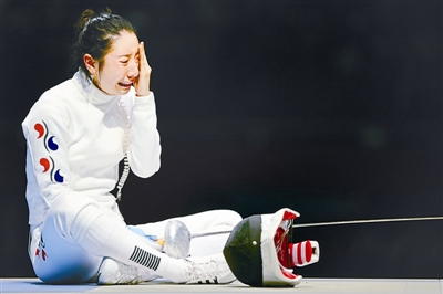 7月30日,韩国选手申雅岚在女子重剑半决赛中失利后,坐地痛哭。CFP供图