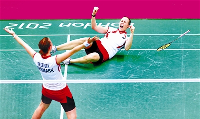 7月31日,丹麦组合在羽毛球小组赛中击败中国选手田卿/赵云蕾后,庆祝胜利。CFP供图
