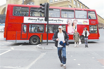 伦敦,一辆红色双层巴士驶过街头,车身上印有伊利牛奶的广告。 李继华 摄