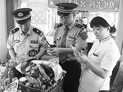为保障暑运期间旅客列车食品安全,乌鲁木齐铁路公安局库尔勒乘警支队日前对餐车食品和原材料的采购、运输、保管、加工、销售各环节实行严格的安全管理,有效堵截无生产厂家、无生产日期、无保质期的“三无”产品上车渠道。图为喀什至乌鲁木齐的K9788/9787次列车乘警配合列车长检查列车食品有效期。(孙婉茹 许荔)