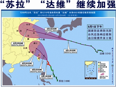 据新华社北京8月1日电 今年第9号台风“苏拉”与第10号强热带风暴“达维”正在同时向我国沿海地区靠近,其中“苏拉”或将在3日前后正面袭击福建省。目前,福建、浙江等地沿海地区正在全力进行防抗台风的各项工作。