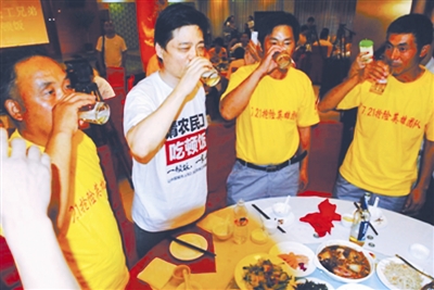 歌手韩红也赶到现场,崔永元称是为了分担有人质疑他们“作秀”的压力,18桌人,小崔一桌桌从头敬到尾。崔永元在不同方言的行酒令下,一杯杯地喝下去,最后有点“高”了。