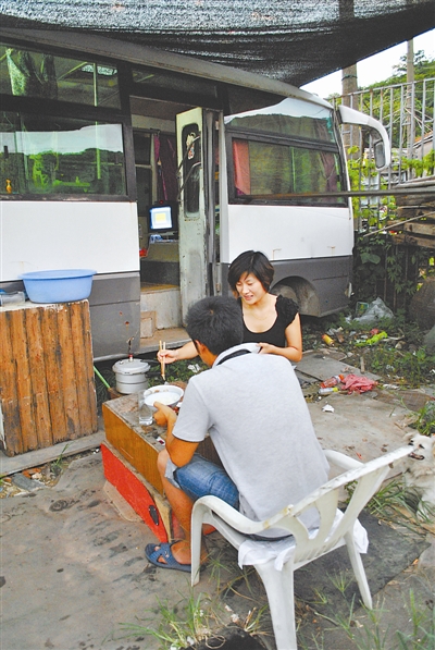7月30日下午,浙江温岭市松门镇远景村一废品场内,一对住在大巴上的90后恋人正在吃饭。