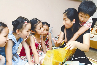 在上海虹口区,由两位妈妈创办的公益性“萤火虫亲子悦读馆”,不仅提供儿童图书,还会安排一些有趣的主题活动丰富孩子的假期生活。比起独生子女孤单的暑期居家生活,“悦读馆”轻松愉快的氛围常常让孩子们流连忘返。图为志愿者在给孩子们讲故事(7月29日摄)。