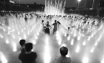 7月31日,湖北省武汉市首义广场大型音乐旱式喷泉运行开放,为人们消暑降温送去清凉,吸引众多市民前来观赏游玩。