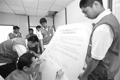 “我承诺:立足岗位,创先争优,在抢险救灾中充分发挥党员先锋模范作用。”8月1日上午,北京建工六建集团房山区抢险救灾临时党支部,在正在抢建的河北镇安置房现场举行了党员承诺签字仪式,负责建设河北镇、南窖乡、中窖村三个灾区安置房项目的几十名党员纷纷在承诺书上郑重签字。顾爽 摄