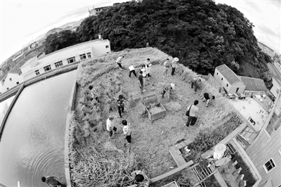 7月31日上午,浙江省温岭市新河镇城北村村委会主任陶正荣正在收割自家厂房顶上种植的水稻。今年5月,陶正荣花了3天时间,雇人将泥土运到厂房顶上,在厂房顶上试种了0.2亩稻子,收获115公斤。试种成功后,今年下半年,陶正荣计划继续种植晚稻,并积极鼓励村里其他有条件的村民也在厂房顶上种植水稻。