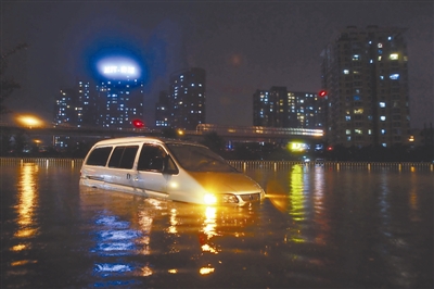 7月21日,北京遭遇大雨,一辆私家车被泡在水中动弹不得。 本报记者 杨登峰 摄