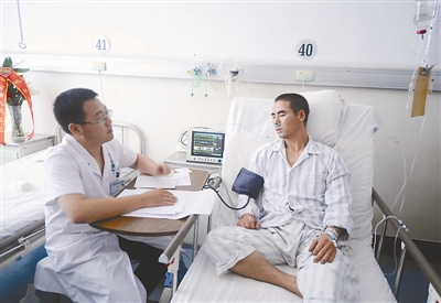 8月4日,心理医生郭宇新(左)在为获救矿工贺全林做心理治疗。当日,记者从山西省临汾市人民医院获悉,在基安达煤矿透水事故中获救的4名矿工恢复良好,各项身体指标正常。目前,医院已经为他们制定了科学的治疗和饮食方案,并安排心理医生对其进行心理干预。