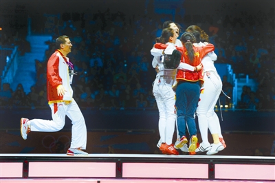 8月4日,中国女队在重剑团体赛中夺冠。图为队员和教练共庆胜利。CFP供图