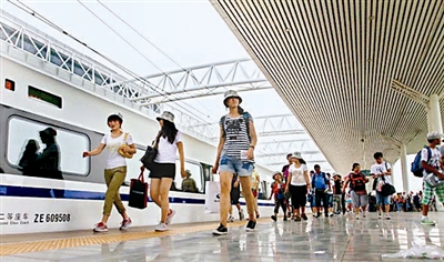 8月4日,旅客乘坐全国首条高速列车旅游专线高速旅游列车从郑州抵达三门峡南站。当日,全国首条高速列车旅游专线——“三门峡·天鹅号”高速旅游列车开行。 该高速旅游列车起止点分别为郑州、三门峡南站,每列定员1000人,每天定时、定点开出,初步确定运营周期一个月。 孙猛 摄