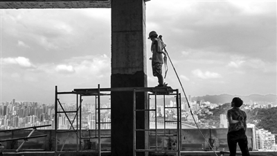 8月6日,重庆市牛滴路一工地,两位建设者在高温下施工。