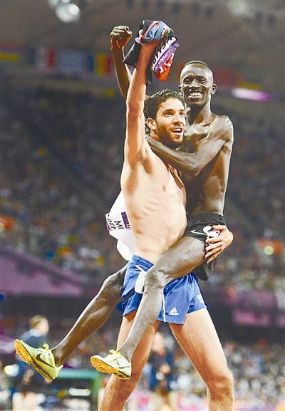 当地时间8月5日,在男子3000米障碍决赛上分获金牌和银牌的肯尼亚选手伊齐基尔与法国选手麦肯西斯相拥。