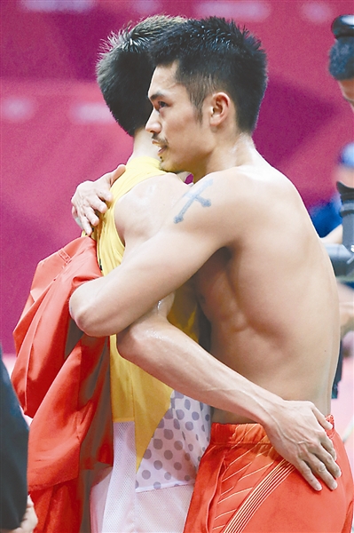 当地时间8月5日,林丹和李宗伟在羽毛球男单决赛后相互拥抱。