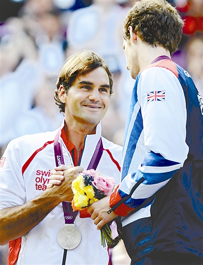 当地时间8月5日,金银牌获得者穆雷和费德勒在网球决赛的颁奖仪式后握手。