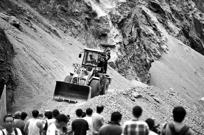 9月9日,云南彝良地震震中洛泽河镇附近道路发生山体崩塌,通往重灾区的救援通道一度被阻。图为工作人员在疏通道路。