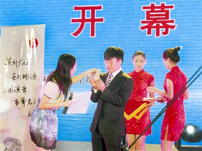 世界围棋名人争霸战抽签仪式9日晚在常德举行。图为主持人在验证中国名人江维杰抽签的序号。