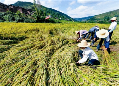 9月10日,云南省楚雄彝族自治州大姚县龙街乡五福村农民在收割超级稻“楚粳28号”。