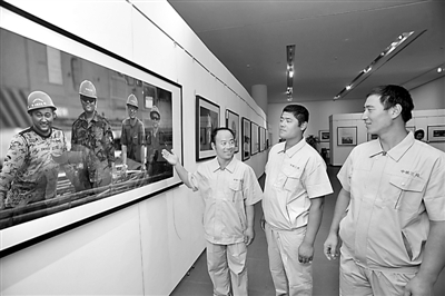 9月11日,天津地铁6号线9合同段项目部建筑农民工陶吉东(左)、杨希强(中)和杨增光在天津美术馆观看影展中自己的照片。为展现建筑农民工风采,住房和城乡建设部直属机关摄协、天津市委规划建设交通工委、市建交委日前共同主办“中国建设者——陈军摄影展”,反映他们勤劳朴实、乐观向上的精神风貌。