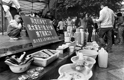 9月13日,云南彝良县人民广场安置点,来自四川彭州的“雷锋哥”刘光建设立的免费服务点。在安置点路边的招牌格外醒目,台阶上,脸盆毛巾、牙膏牙刷、鞋油鞋刷一应俱全,市民和参加抗震救灾的人员都可以免费使用。杨峥 摄