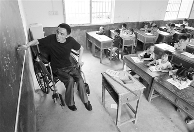 9月10日,江西九江瑞昌市范镇镇九源中心小学教师李玉明正在为孩子们上数学课。现年59岁的李玉明从1974年在家乡开始任教,至今已有38个年头。2003年,由于病痛,他只能改坐轮椅,由他的爱人背进课堂,坚持为学生讲课。明年,李玉明就要退休了。他说,我教了40年的书,我一定要站好最后一班岗,为自己挚爱的乡村教育事业奉献最后的心血和汗水。