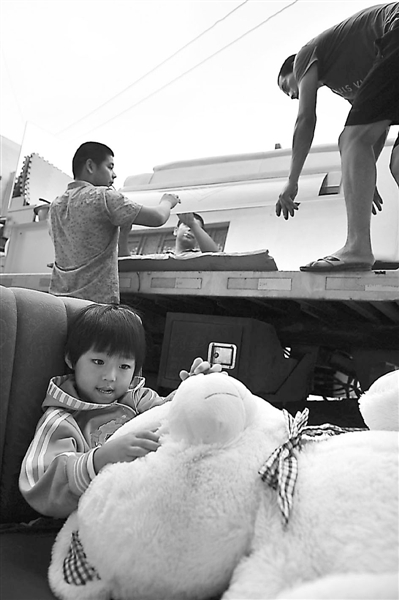 四周岁的王智涵对搬迁似乎没有概念,大人忙着搬家时,她在一旁玩着娃娃熊
