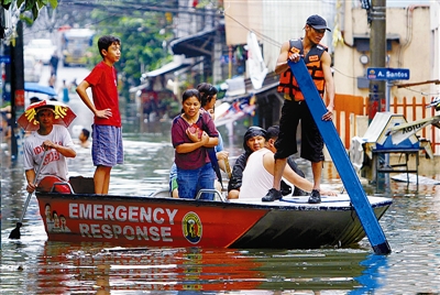 当地时间9月15日,今年第13号超强台风“鲇鱼”袭击菲律宾,并继续往日本南部推进。台风造成连续大雨,导致菲律宾首都马尼拉市许多街区被洪水淹没。图为当地民众划着小船在市区街道上。吉平 供图
