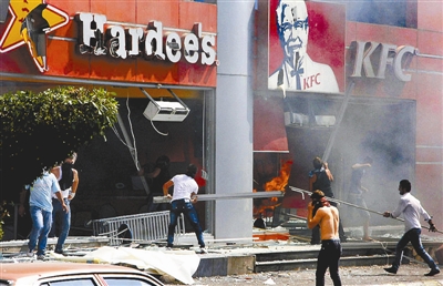 美国争议电影引发“反美浪潮”。图为当地时间9月14日,在黎巴嫩北部城市的黎波里,抗议者打砸当地哈迪斯店和肯德基餐馆。谢涛 供图
