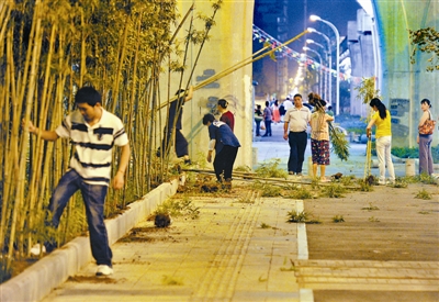 15日晚9时30分许,笔者闻讯赶至现场时,仍有七八名男女在现场偷采绿化竹,见拍照,这伙人才匆匆离去。笔者围着绿化林转了一圈发现,至少上千棵绿化竹被连根拔起,倒伏在地面上。汉友 摄
