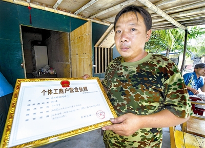 海南三沙市建设工程有限公司和三沙海航旅游投资有限公司分别于8月23日和9月6日在海南省工商局登记成立,成为三沙市最早成立的两家企业。7月13日,22户三沙市永兴岛渔民取得个体工商户营业执照。骆云飞 摄