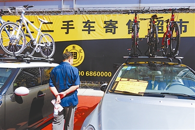 一位观众在某“二手车寄售超市”前观看二手车。