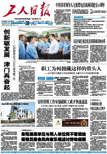 9月18日下午,中共中央总书记、国家主席、中央军委主席胡锦涛在天津出席发展中国家科学院第十二次学术大会暨第二十三届院士大会开幕式后,由中共中央政治局委员、国务委员刘延东和中共中央政治局委员、天津市委书记张高丽等陪同,来到天津一些高新技术企业,就实施创新驱动发展战略进行调查研究,同干部群众共商加快转变经济发展方式、保持经济平稳较快发展大计,勉励大家同心协力、奋发进取,以优异成绩迎接党的十八大胜利召开。