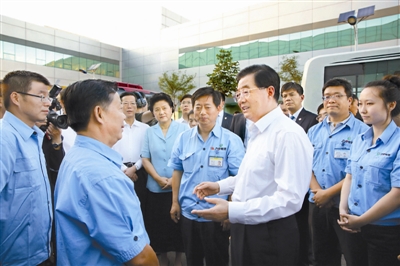 9月18日,中共中央总书记、国家主席、中央军委主席胡锦涛在天津考察高新技术企业。图为胡锦涛在天津力神电池股份有限公司同企业员工亲切交谈。 新华社发