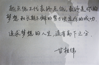 “只想当小人物的人,永远也出不了头。小人物也要有奋斗,没有奋斗的人生,注定是失败的人生。”甘相伟肯定地告诉记者,他希望自己的奋斗历程能够感染、激励更多处于社会底层的人们奋发向上。而改变小人物命运的最好的方式就是知识。“知识改变命运,从大山里走出来的我对此深有感触,是知识的力量支撑我走到现在。”