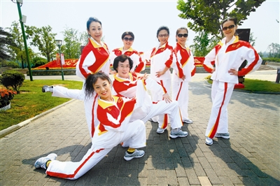 我参与我快乐——北京代表团派出198人的参赛队伍出征全国第七届农民运动会,参加摔跤、花毽、健身秧歌等13个项目的比赛,参赛规模创历届新高。图为代表北京参赛的延庆健身秧歌队队员在照相机前摆造型。