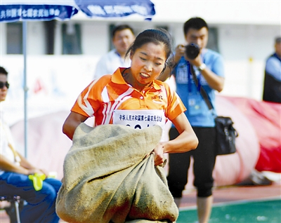 抢收抢种——农运会田径比赛的项目可以说最能体现农民的特色,与农民的日常劳动密不可分,如投掷秧苗、5人抗洪、30米搬重物……全是农民生活的再现,有着很强的趣味性和观赏性,也是农民观众最喜爱的项目。