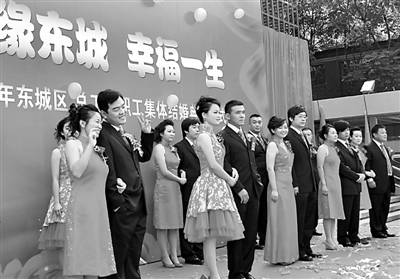 鲜花绽放,礼炮轰鸣。9月16日,来自北京市东城区的12对新人在东城区红剧场广场,举行了一场温馨浪漫的职工集体婚礼。这场主题为“情缘东城,幸福一生”的集体婚礼是东城区总工会“面对面、心贴心、实打实、服务职工在基层”活动的一项重要举措。自2009年以来,区总利用三级服务体系平台,积极开展服务职工工作。3年来,各级工会共开展单身职工交友联谊活动43场,服务单身职工3952人次。本报记者 张菁 摄
