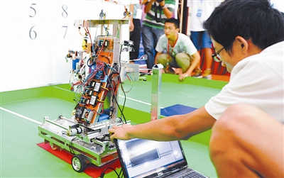 9月15日,中国科学技术大学举行第十二届Robo Game机器人大赛,来自中科大的44个学生代表队带着他们亲手制作的机器人参加了机器人巧算24和机器人献花两个项目的比赛。据悉,中科大旨在通过举办Robo Game机器人大赛培养大学生的科技创新精神和动手实践能力。这是一名学生在巧算24比赛中调试机器人。