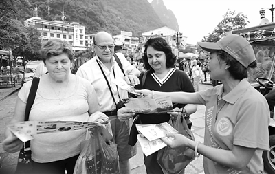 在熙熙攘攘的“地球村”里,活跃着一支党员志愿者服务队,他们身着色彩鲜明的统一制服,为来自世界各地的游客提供包括旅游服务、纠纷调解、政策宣传、环保监督等方面的服务。 新华社记者 陆波岸 摄