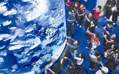 9月20日,在青岛海底世界里,不少环卫工第一次看到了海下的世界,不少人兴奋地合影留念。
