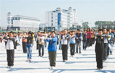 9月21日,黑龙江省八五二农场职工及外来农民工的孩子们在新教学园区操场做操。“虽然我们身为农民工,但是在农场的关怀呵护下,我们各方面的生活待遇与农场人一样!”为孩子办理入学手续、来农场工作两年的农民工李胜利兴奋地说。这是黑龙江省八五二农场为解决农民工子女就学问题、服务民生的一个缩影。