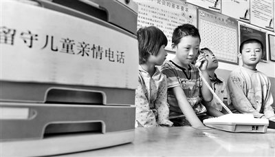 9月27日,河北省昌黎县凤凰山乡小学四年级学生齐子研(左二)在学校用亲情电话给在外地打工的父母打电话。中秋、国庆双节临近,河北省昌黎县妇联、教育局针对全县外出打工人员多的特点,专门在13所农村小学校园内设立了亲情电话,供留守儿童在课余时间免费与父母联系。新华社记者 杨世尧 摄