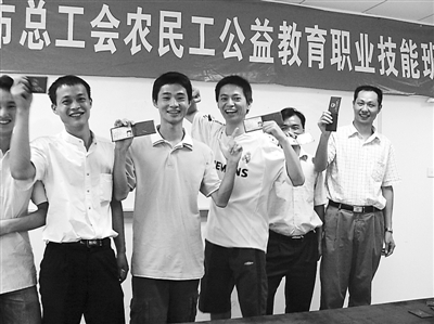 深圳市总开展农民工公益教育职业技能培训。图为一批拿到技能资格证书的农民工开心合照。