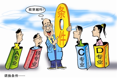 据记者了解,目前大部分高校尚不允许本科生就读期间自由转换专业,少数允许学生在大二时有条件转专业的高校,不但允许转专业的名额寥寥无几,而且对学生大一阶段的成绩有非常苛刻的要求,并且学生的高考成绩必须达到转向的专业当年的录取分数线,另外学生转向的专业,通常也要求有人必须转出,这样才能保持各专业的毕业人数不会比录取时多,以免在学生毕业时带来不必要麻烦。