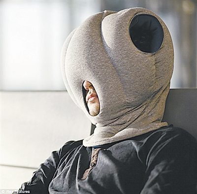 设计师发明了一种神奇的“驼鸟枕”。戴上它后,人们就可以随处打盹,完全不必担心会脖子酸。这种套头枕的下方有一个圆孔,供使用者把头套进去。正面有一个可露出嘴和鼻子的洞,以便使用者自如呼吸。顶部还有两个边孔,如果使用者想趴在桌子上小憩,就可以把手伸进去。阿康 文/图